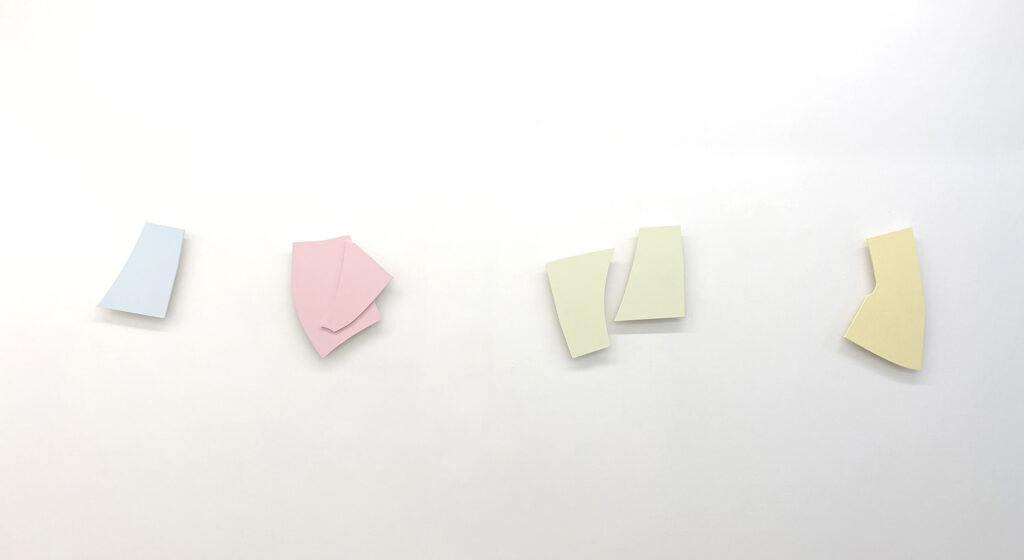 전시 주제인 ‘Mute structure’(침묵하는 구조)는 인체나 사물을 하나의 정적인 오브제를 함축하기 위한 비유적인 표현이다. 무엇보다 이번에 전시된 김건이의 ‘패턴의 선’은 음악(재즈)을 들으며 가위로 선을 그릴 때, ‘호흡’의 흐름을 통해 패턴이 완성된다. 부제인 ‘숨, 머묾, 전이’의 단계는 단순히 옷의 본을 만드는 기술적 단계를 넘어서 예술적 수행의 과정이자 디자인을 통해 평면이 입체가 되는 과정에서 생성 변화하는 리듬이다.